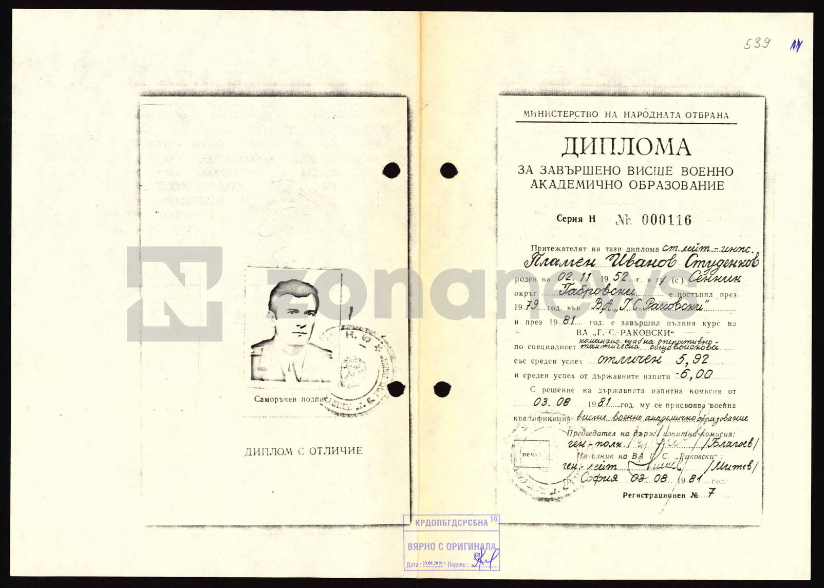 Ето какво показват разсекретените документи от архива на РУМНО за тези проблемни хора, които са били на ключови позиции във военното ни разузнаване. Пламен Иванов Студенков е роден на 2.11.1952 г. в с. Сенник, Габровски окръг. Баща му Иван Събев Студенков е партиен секретар на цех 200 при ЗСА "Ст. Бъчваров". През 1970 г. завършва средно образование в гр. Севлиево и същата година кандидатства във ВНВУ "В. Левски", профил "мотострелкови". Военното училище завършва през 1974 г. с доста нисък успех - 4,72. Член е на БКП от 1974 г., приет е в 392 ППО (първична партийна организация) на ВНВУ. От същата година до 1979 г. е командир на взвод и рота във ВНВУ "В. Левски". През 1975 г. сключва брак с Надежда Стефанова от Русе. Съпругата му има сестра-близначка, която е работила в Градския народен съвет в Дебелец. През 1976 и 1979 г. му се раждат две деца - Иван и Стефан.
