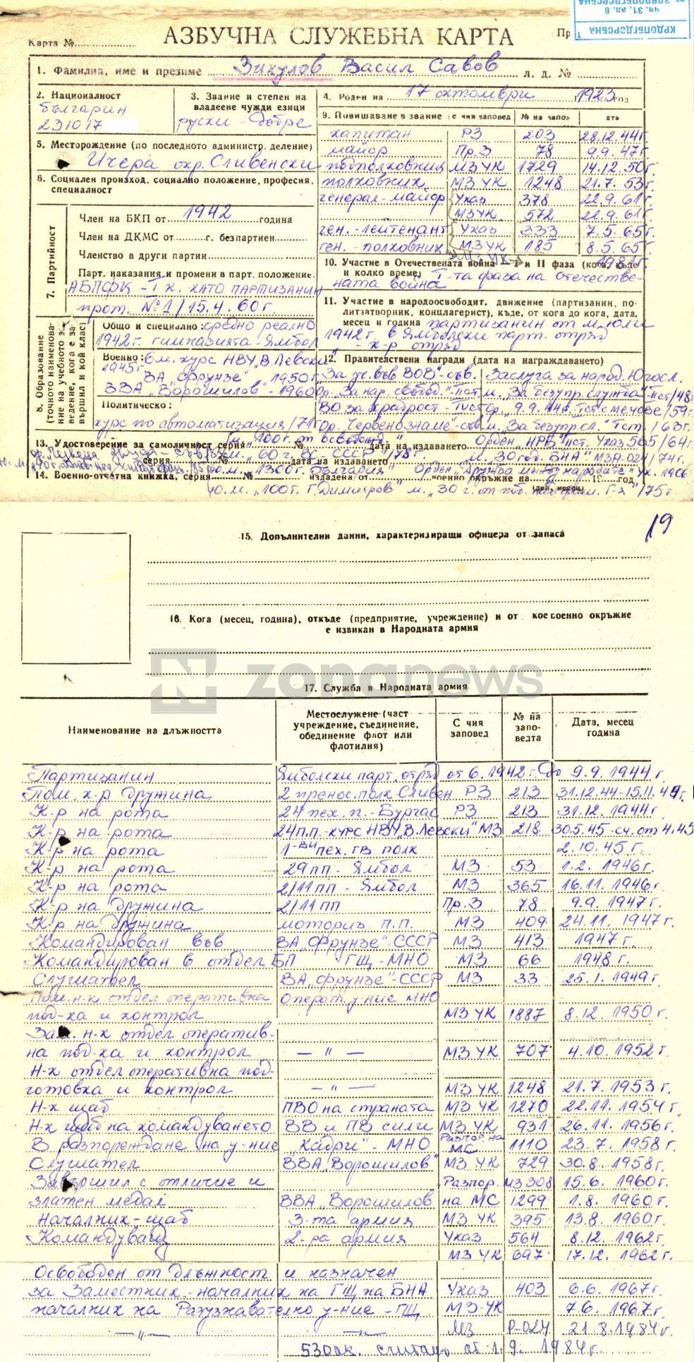 Четем "План – предложение за обсъждане в Колегиума на МНО разстановката на политическите офицери от българската народна армия – номенклатура на Колегиума и на ЦК на БКП на заседанието на 29.08.1983 г. Тук подполковник Стоимен Цветанов Стоименов е описан с всички подробности. Роден на 24 септември 1942 г. в с. Щърково, Пазарджишки окръг. Член е на БКП от 1963 г.! Вижте сега каква е кариерата на "експерта" по национална сигурност Стоимен Стоименов: в БНА е офицер от 1965 г. като командир на взвод; после секретар на ПК на ДКМС; помощник-началник по работата сред членовете на ДКМС в съединение; инструктор в отдела "За работа сред членовете на ДКМС" – ГлПУНА; ст.помощник началник на отдела "За работа сред членовете на ДКМС" – ГлПУНА; зам.-началник на отдела "За работа сред членовете на ДКМС" – ГлПУНА; началник на отдела "За работа сред членовете на ДКМС" в ПУ на СВ; ЗКПЧ (заместник-командир по политическата част), той началник ПО на 11 тбр (танкова бригада); ЗКПЧ, той и началник на политотдела на 1 мсд (мотострелкова дивизия). 100-процентов комунистически политически офицер, от онези, които осигуряваха налагането на болшевишката идеология в армията и следяха зорко някой да не се отклони от "правата линия" на партията.