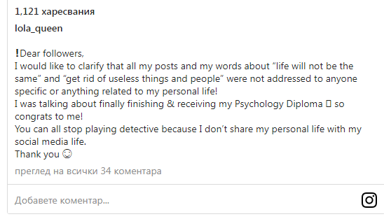 В по-късна публикация красивата Лолита пусна друг пост, с което сложи край на спекулациите по въпроса разделя ли се с българския тенисист.