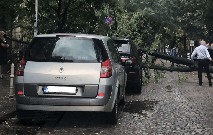 Дърво е паднало върху автомобил на ул. "Кракра" в София. Причината са извилите се бури в столицата, съобщава БНТ.
