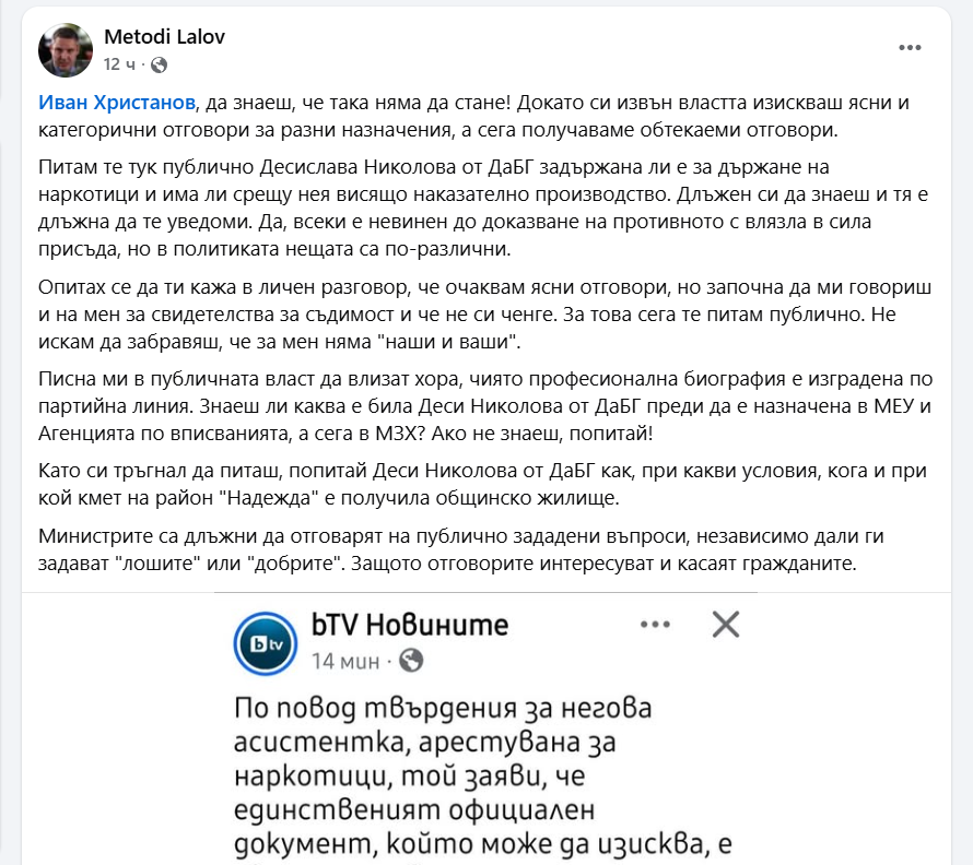 Питам те тук публично Десислава Николова от ДаБГ задържана ли е за държане на наркотици и има ли срещу нея висящо наказателно производство. Длъжен си да знаеш и тя е длъжна да те уведоми. Да, всеки е невинен до доказване на противното с влязла в сила присъда, но в политиката нещата са по-различни", заяви Лалов в социалната мрежа.