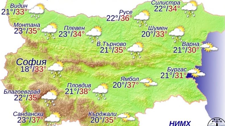 По-късно вечерта и през нощта срещу петък явленията ще обхванат и източните райони, като в Североизточна България се очаква гръмотевичните бури да са мощни, с повишена вероятност за обилни валежи и градушки. През деня вятърът в повечето райони ще е южен, но след обяд ще започне да се ориентира от северозапад. Отново ще е горещо с максимални температури предимно между 33 и 38 градуса.