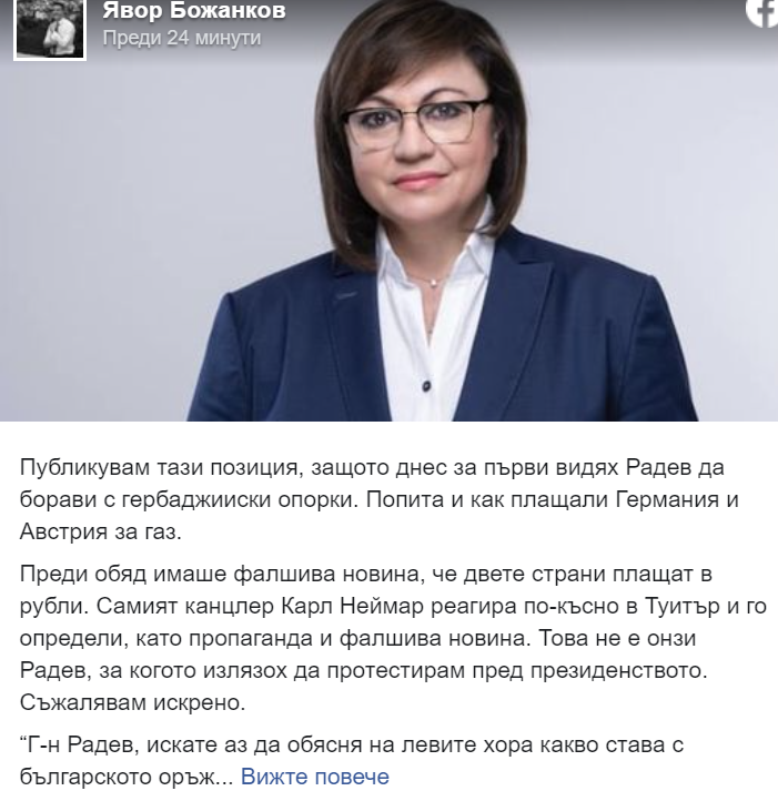 Публикувам тази позиция, защото днес за първи видях Радев да борави с гербаджииски опорки. Попита и как плащали Германия и Австрия за газ, пише депутатът от БСП Явор Божанков.
