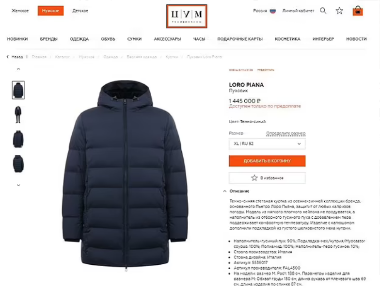 Lora Piana е марка специализирана в кашмирени дрехи или такива от изключително висококачествени материи. Парката на Путин е от ветроустойчива материя, с пълнеж от пух и пера, и с подплата в качулката от копринена нутрия През 2013 брандът става собственост на френския холдинг LVMH. Парадоксът е, че след началото на войната в Украйна цялата група на модната къща LVMH се изтегли от руския пазар и обяви многомилионна помощ, която да е в подкрепа на Украйна.