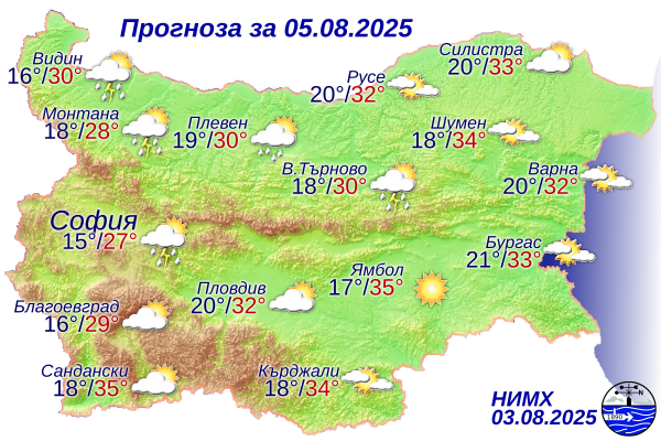 През деня главно над Западна България ще се развива купесто-дъждовна облачност. Ще има краткотрайни валежи, придружени с гръмотевици, като по-интензивни ще са явленията в крайните западни райони и в планините. Има условия и за градушки. Предимно слънчево ще се задържи времето в Централна и Източна България. Вятърът в Западна България ще започне да се ориентира от северозапад, в Дунавската равнина ще е умерен и временно силен. В останалата част от страната ще остане от изток-югоизток, слаб до умерен. Максималните температури ще бъдат от 27°-28° във високите полета в Югозападна България до 34°-35° в югоизточните райони, в София – около 28°.