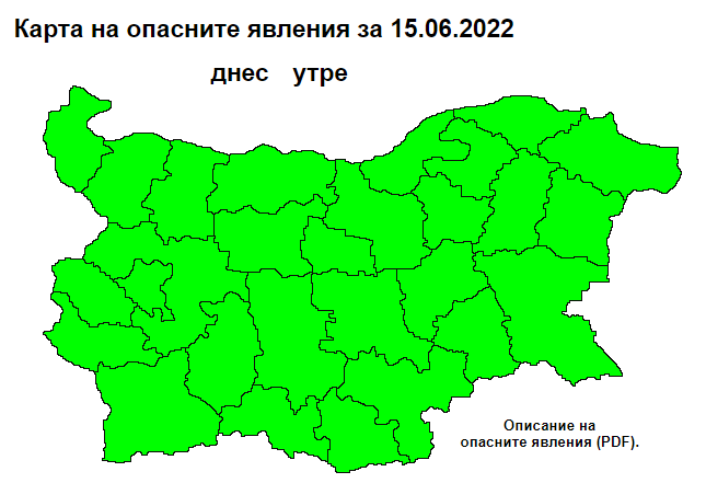 Максималните температури ще са между 24° и 29°, в София около 24°. Такава е прогнозата на Национален институт по метеорология и хидрология.