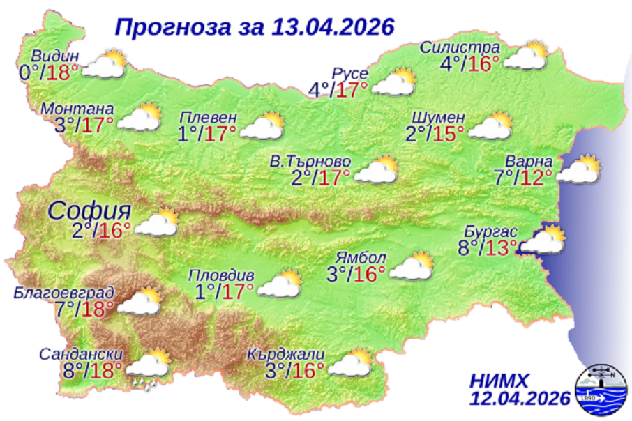 Минималните температури ще бъдат между минус 1° и 4°, по долното течение на Струма и Места с 2°-3° по-високи, а в района на София – около 2°, прогнозират от НИМХ.