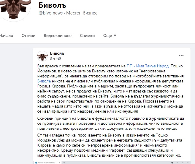 От тази гледна точка, посочването на „Биволъ“ в извинението на Тошко Йорданов /без да можем да коментираме неговата същност/ към депутатката Кирова, е само по себе си „непроверена информация“ и най-малкото некоректно. Срещу подобни медийни прецеденти, създаващи спекулации и манипулации в публиката, „Биволъ“ винаги се е противопоставял категорично“, написаха журналистите от медията в страницата си във Фейсбук.