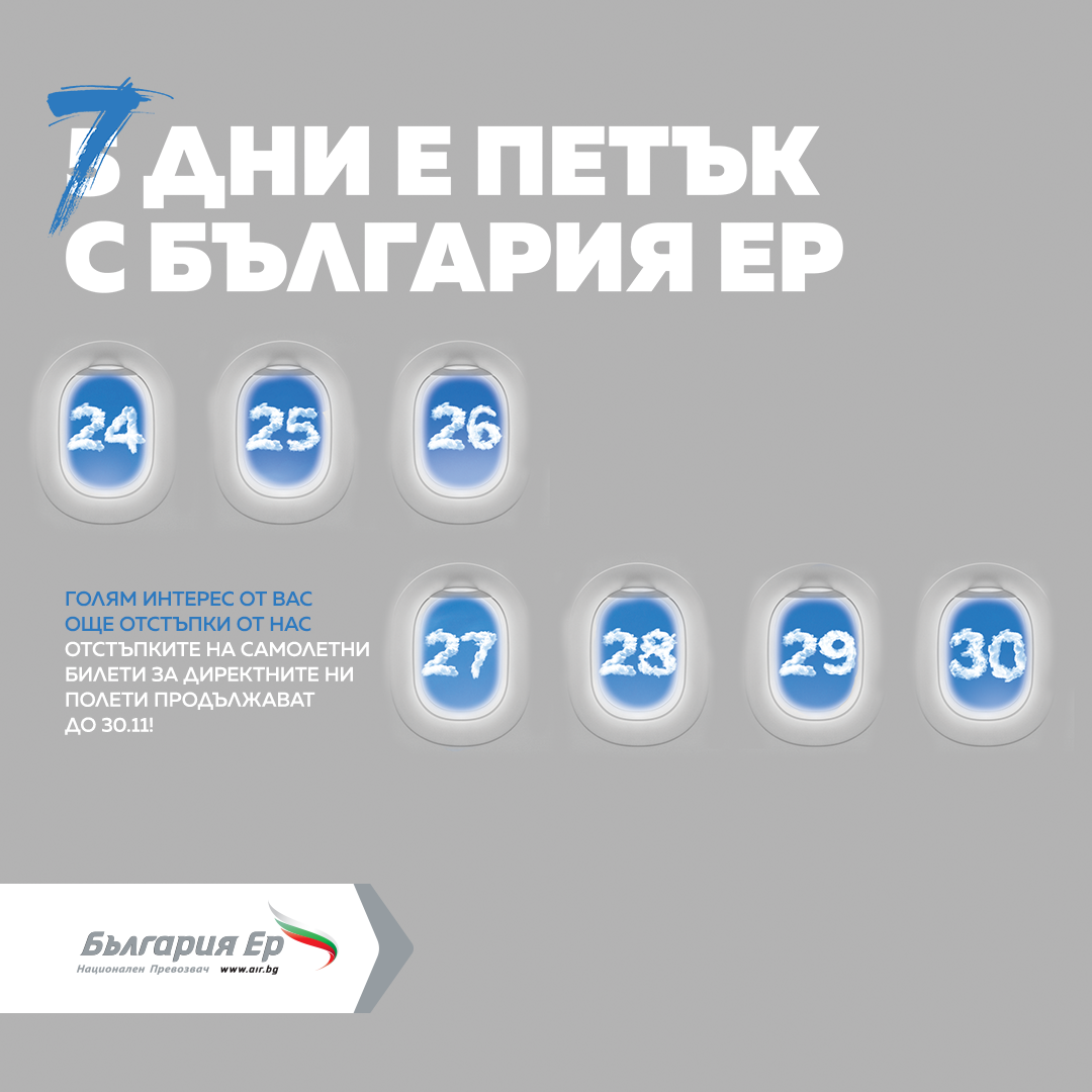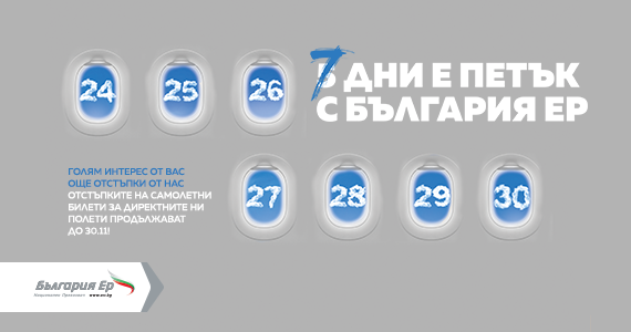 Кампанията „5 дни е петък“ започна на 24 ноември и поради нестихващия интерес и постоянните запитвания от клиенти, „България Ер“ реши да даде бонус от още 2 дни на пътниците да се възползват от специалните цени.