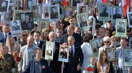 Путин начело на "Безсмъртния полк" в Москва със снимка на баща си