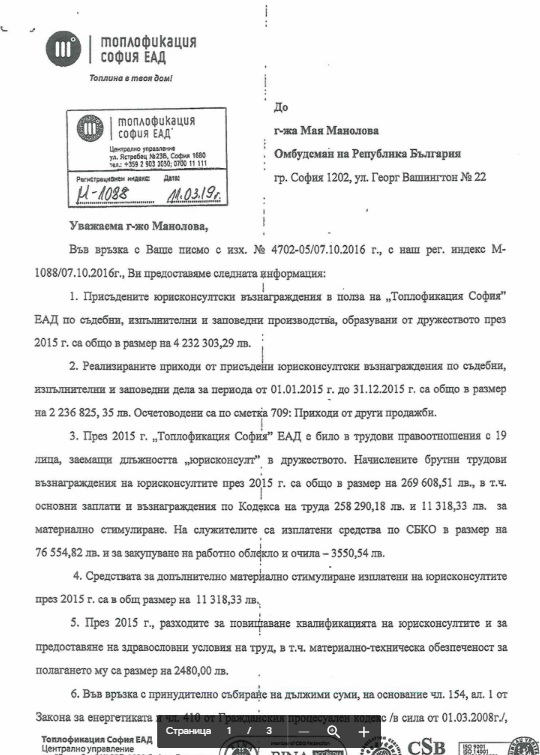 "В изпълнение на Решение № 1149 на Административен съд София-град „Топлофикация София“ ЕАД предостави в рамките на законово определения срок отговори на въпросите, посочени в заявлението на Омбудсмана на Р България. Данните за юрисконсултските възнаграждения са били представени в доклад от 13 февруари 2017г. на Агенцията за държавна финансова инспекция/ № ДИ1СФ-8/13.02.2017г. / след извършена финансова инспекция на „Топлофикация София” ЕАД и са били изпратени и до екипа на омбудсмана.