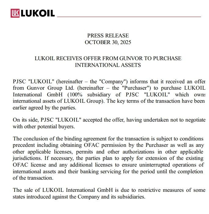 По-конкретно, Gunvor Group Ltd. е предложила да придобие 100% от Lukoil International GmbH. Lukoil е приела офертата. По този начин руската компания се е съгласила да не преговаря с други потенциални купувачи.