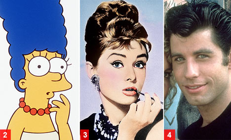 Следващи по популярност са синият кок на Мардж Симпсън от "Семейство Симпсън", както и незбравимият кок на Одри Хепбърн от "Закуска в Тифани" и мачовската прическа на Джон Траволта в "Брилянтин".