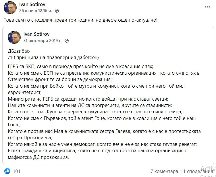 Сотиров направи уточнението, че е дефинирал основните принципи на правоверния дабегеец преди три години, но с днешна дата те звучат дори по-актуални.