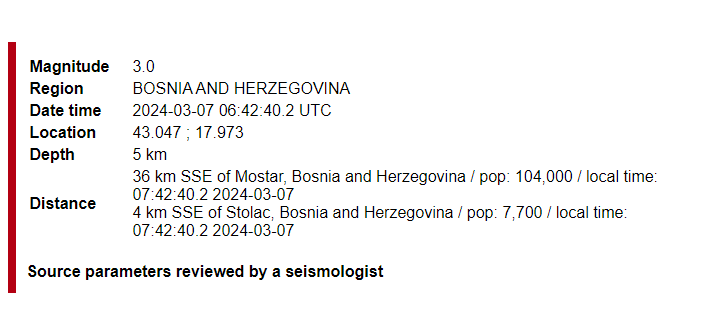 Епицентърът е бил на 29 км от град Мостар. Няма данни за нанесени материални щети.