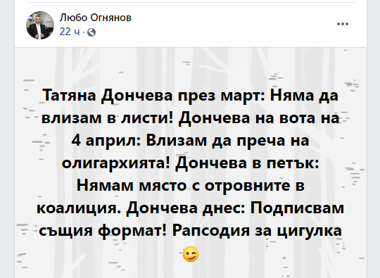 Татяна Дончева през март: Няма да влизам в листи! Дончева на вота на 4 април: Влизам да преча на олигархията! Дончева в петък: Нямам място с отровните в коалиция. Дончева на 24 май: Подписвам същия формат! Рапсодия за цигулка.