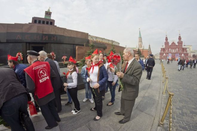 Комунистите в Русия отбелязаха рождения ден на Ленин с полагане на цветя пред мавзолея в сърцето на Москва, където е изложено мумифицираното му тяло, пише "Москва таймс".