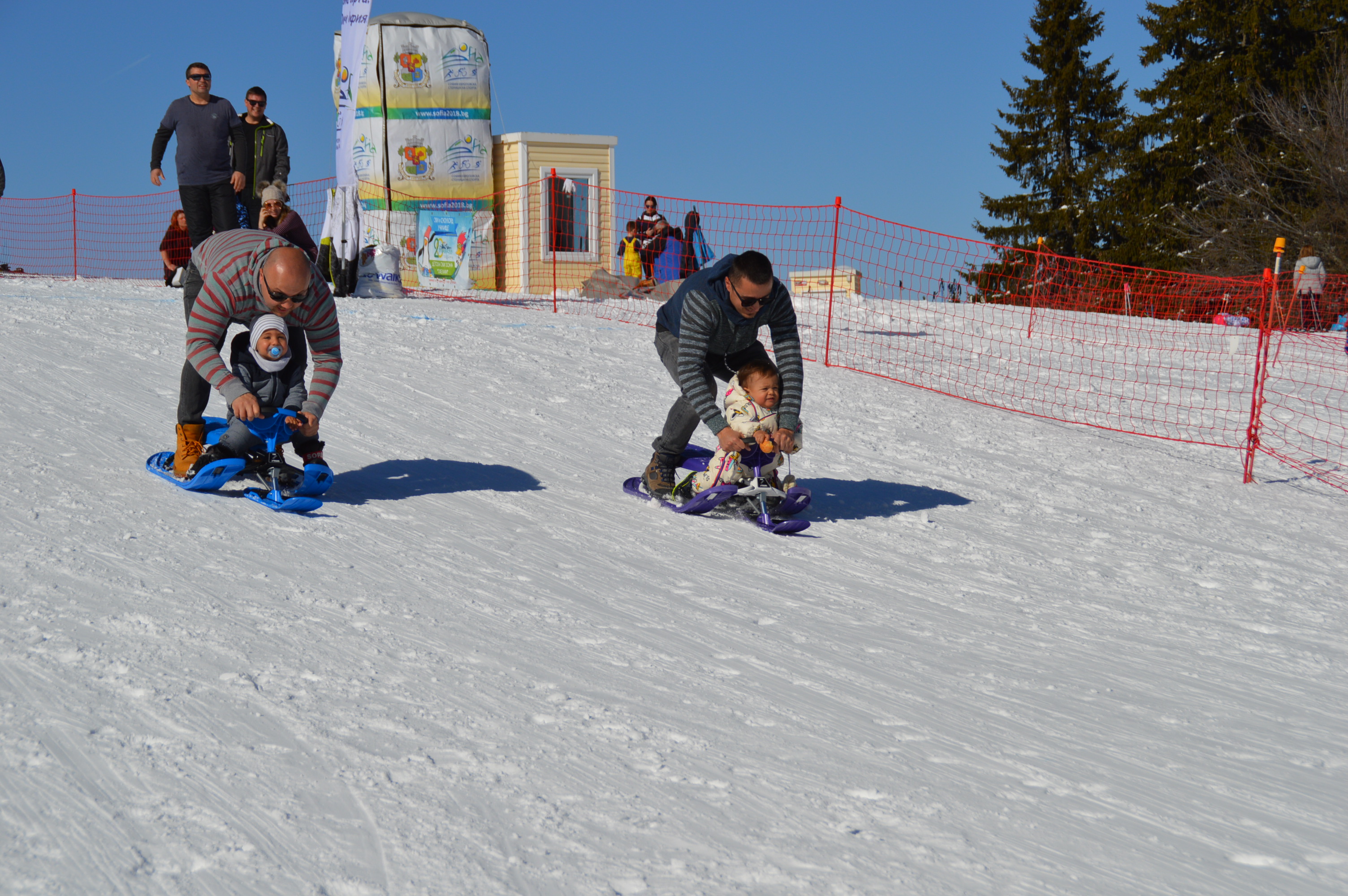 Най-много емоции и възгласи събра състезанието по спускане с шейни на семеен принцип с участието на дете и родител (роднина). В много от надпреварите организаторите се затрудняваха да преценят кой пръв пресича финалната линия по импровизираното трасе, а снежните „болиди“ бяха подкрепяни от многобройна публика. След продължителни квалификации и директни елиминации шампион с минимална преднина стана 6-годишният Кристиян Димитров, изпреварил във финала Явора Христова и разделилите третото място Никола Гяуров и Георги Желев, който се оказа и най-малкият участник със своите година и 8 месеца.