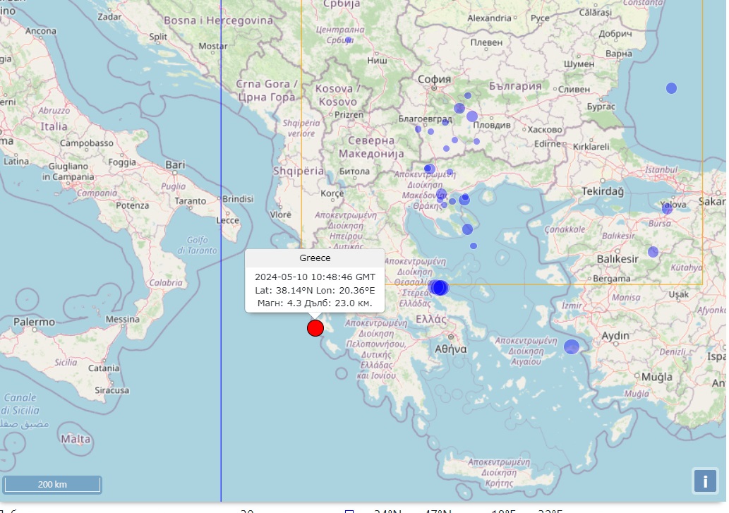 Трусът е бил с магнитуд 4,3 по Рихтер, на дълбочина от 23 километра. Станало е в 13:48 часа българско време край гръцкия остров Кефалония.