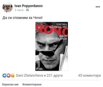 Бащата на Чочо, Иван Попйорданов, накара приятелите си във Фейсбук да си спомнят за незабравимия му син. "Да си спомним за Чочо", написа той над снимка на корицата на книгата, написана от бащата за популярния му син.