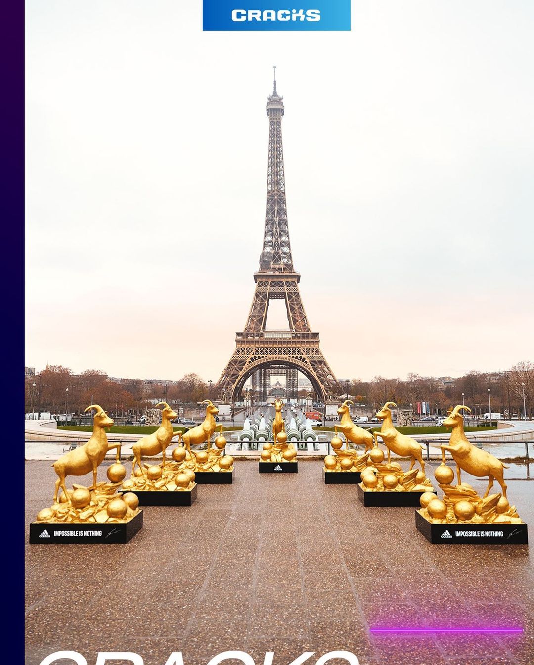 От спортния концерн наредиха седем статуи на козли пред Айфеловата кула в Париж, като в краката на всяка има по 7 златни топки.