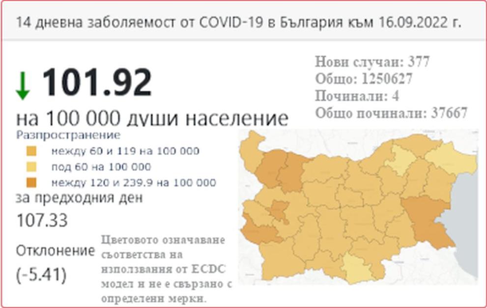 101.92 на 100 хиляди души достигна двуседмичната заболеваемост от COVID-19 в страната. Това показва справка на Дарик в системата на здравните власти. Това е пореден ден със спад в заболеваемостта по този показател, като се очаква до дни тя да падне под 100 на 100 хиляди заразени.