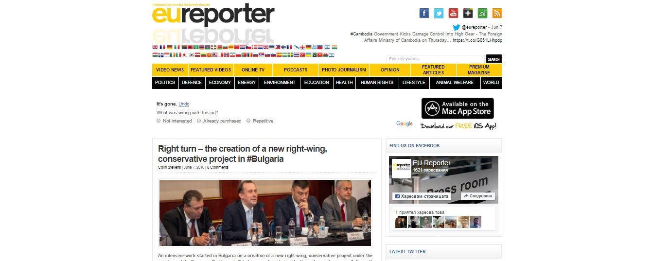 „Завой на дясно“ – създаването на нов десен консервативен проект в България“ – под това заглавие авторитетната европейска медия EUreporter публикува на официалния си сайт обширен материал за провелата се в България конференция, организирана от евродепутата Николай Бареков.