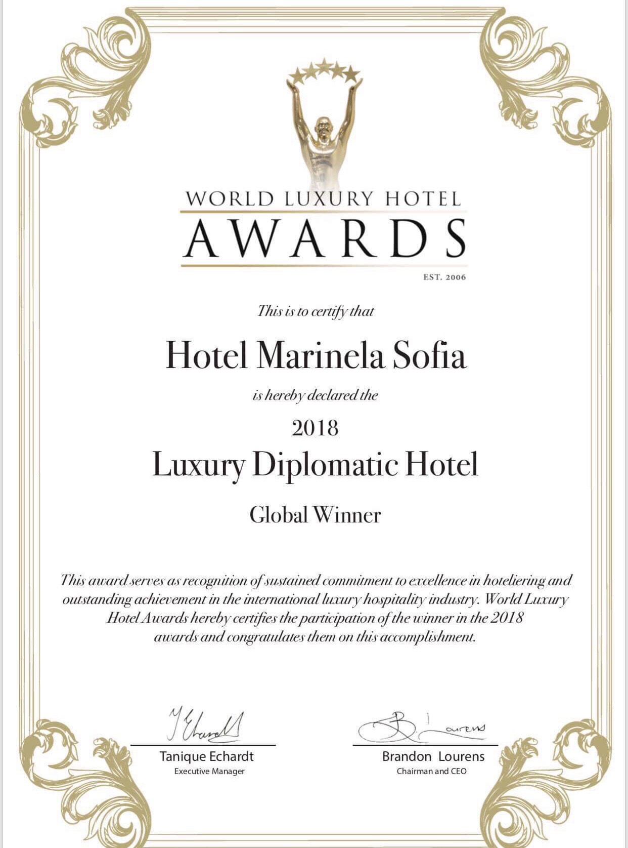 Екипът на хотел Marinela Sofia е признателен за високата оценка на World Luxury Hotel и отговорно ще продължава да изпълнява мисията да се грижи за гостите си съгласно най-високите критерии в сегмента на световния луксозен туризъм.