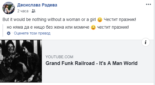 С текст на английски, че светът би бил нищо без жените и момичетата, поздрави българките съпругата на президента Румен Радев Десислава Радева. "But it would be nothing without a woman or a girl :) Честит празник!", написа тя на страницата си във Фейсбук и постна парчето "Мъжки свят" на американската група Гранд фънк рейлроуд, нашумяла през 70-те години на миналия век ("It's A Man World", Grand Funk Railroad).