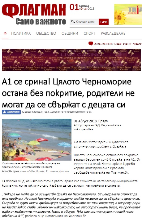 „Никъде не може да се осъществи връзка по Черноморието. От централата отричат да има проблем. На плаж Нестинарка е страшно, майки не могат да се свържат с децата си. Създава се един хаос и дискомфорт за потребителите на този оператор, а насреща дори не казват какво става. Звънях им няколко пъти, но отговорът винаги беше, че проблемът идва от мобилните ни апарати, което е абсурд. Тука сме стотици души и никой няма обхват на А1”, разказала още читателката на Флагман.бг.