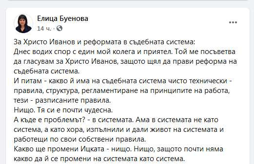 За Христо Иванов и реформата в съдебната система: Днес водих спор с един мой колега и приятел. Той ме посъветва да гласувам за Христо Иванов, защото щял да прави реформа на съдебната система. И питам - какво й има на съдебната система чисто технически - правила, структура, регламентиране на принципите на работа, тези - разписаните правила. Нищо. Тя си е почти чудесна. А къде е проблемът? - в системата. Ама в системата не като система, а като хора, изпълнили и дали живот на системата и работещи по свои собствени правила. Това коментира на страницата си във Фейсбук адвокат Елица Буенова.