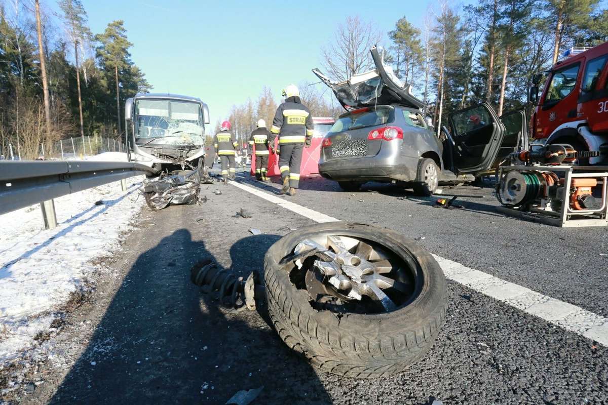 Сблъсъкът е станал по маршрута Олщин - Добре Место. Пътят е блокиран, а децата от автобуса са увити с предпазно фолио срещу студа.