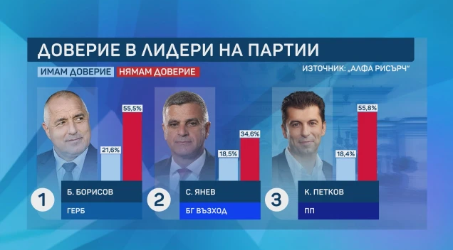 Бойко Борисов е на челна позиция с 21,6 процента доверие. След него анкетираните имат най-голямо доверие на Стефан Янев - 18,5 на сто. Кирил Петков е на трета позиция с 18,4 на сто.