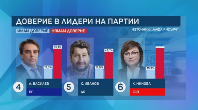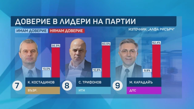 Доверието към Костадин Костадинов е 13%, към Слави Трифонов - 10,8 на сто. Лидерът с най-малко доверие е Мустафа Карадайъ - под 10%.