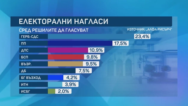 "Продължаваме промяната" са втори - със 17,5 на сто. ДПС е с 10,9%, а БСП с 9,8 на сто.