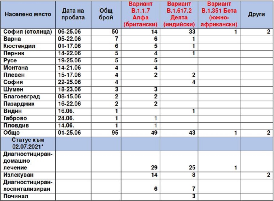 43 случая на Делта вариант на SARS-CoV-2, известен като Индийски вариант, и един случай на Бета вариант, известен като Южноафрикански, са установени от НЦЗПБ чрез целогеномно секвениране. Това съобщават от здравното министерство. Анализирани са общо 95 клинични проби, при 93 от тях се установиха вирусни варианти с повишено значение за общественото здраве, от тях: 49 (51.6%) са B.1.1.7 Алфа (британски), 43 (45.3%) са B.1.617.2 Делта (индийски) и 1 (1.1%) е B.1.351 Бета (южноафрикански). Пробите са взети от пациенти с COVID-19 в периода 01-25 юни 2021 г. и са от 14 области на страната.