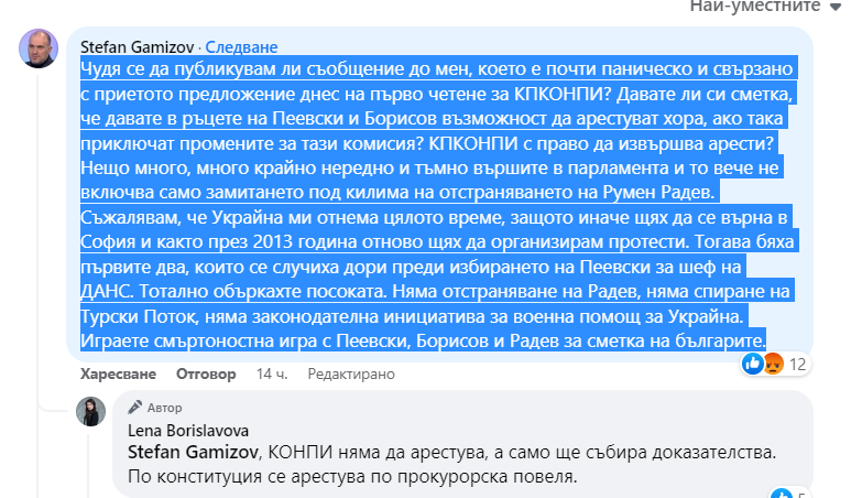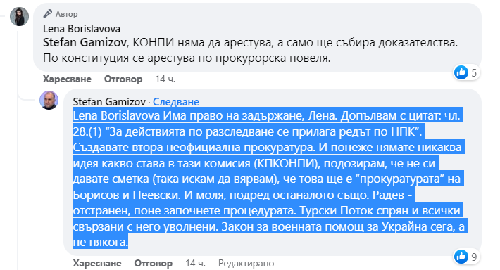 По същата тема Гамизов се включи с коментари и под публикация на Лена Бориславова.