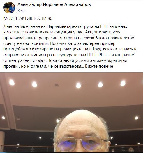 "Днес на заседание на Парламентарната група на ЕНП запознах колегите с политическата ситуация у нас. Акцентирах върху продължаващите репресии от страна на служебното правителство срещу негови критици. Посочих като характерен пример полицейското блокиране на редакцията на в.Труд, както и заплахите отправени от министъра на културата към ПП ГЕРБ за "изхвърляне" от централния й офис",  написа в профила си във "Фейсбук" евродепутатът Александър Йорданов. "Това са недопустими антидемократични прояви , но и сигнали, че се възстановяват методи и практики от времето на тоталитарния комунистически режим", твърди той.