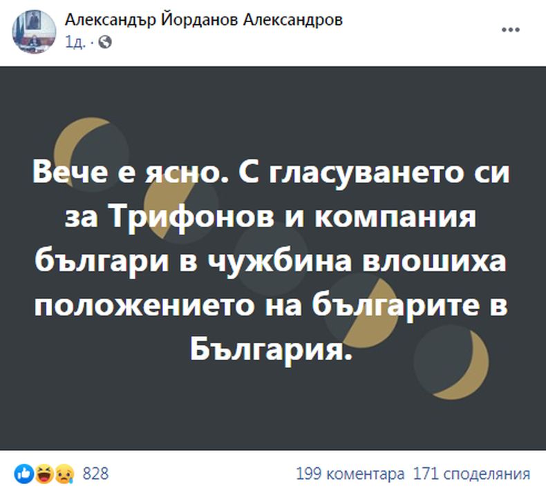 "Вече е ясно. С гласуването си за Трифонов и компания българи в чужбина влошиха положението на българите в България", категоричен е Александър Йорданов.