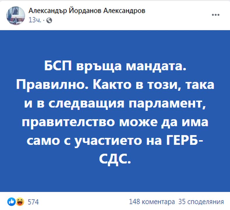 "БСП връща мандата. Правилно. Както в този, така и в следващия парламент, правителство може да има само с участието на ГЕРБ-СДС", написа в профила си във "Фейсбук" евродепутатът Александър Йорданов. Коментарът му е по повод обявената вчера от Корнелия Нинова новина, че БСП ще върне мандата и няма да протака.