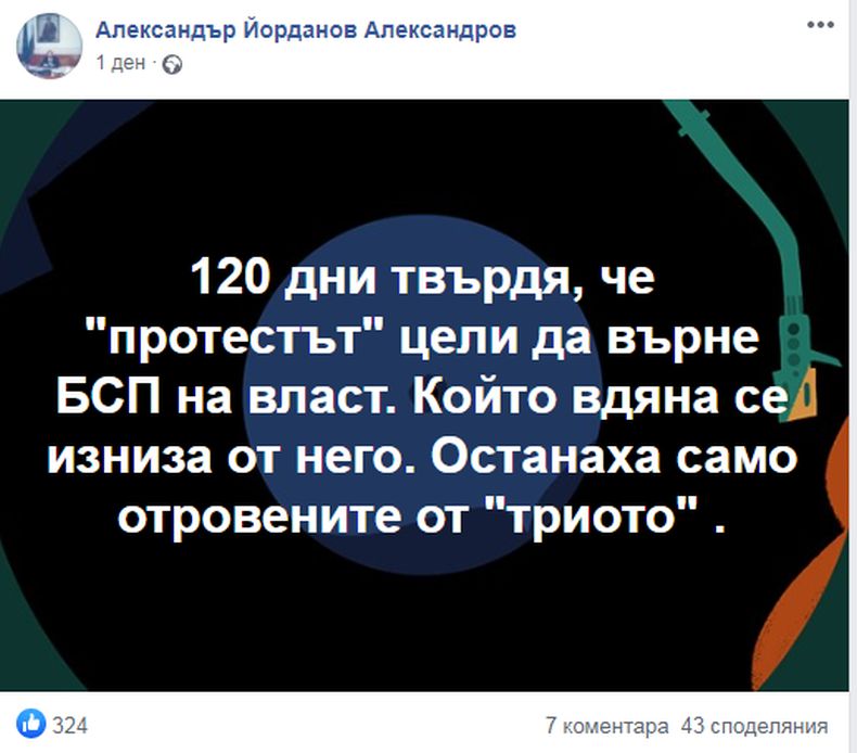 "120 дни твърдя, че "протестът" цели да върне БСП на власт. Който вдяна се изниза от него. Останаха само отровените от "триото" , написа в профила си във "Фейсбук" евродепутатът Александър Йорданов.