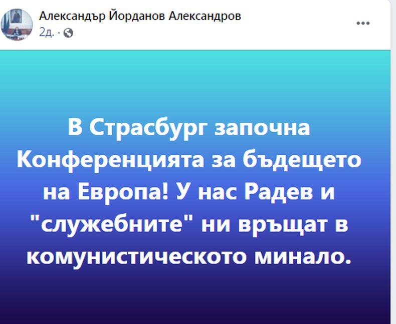 "В Страсбург започна Конференцията за бъдещето на Европа! У нас Радев и "служебните" ни връщат в комунистическото минало", написа в профила си във "Фейсбук" еврадепутатът Александър Йорданов. Още веднага колегата му Асим Адемов подкрепи твърдението му с думите: "Когато Европа обсъжда своето бъдеще, ние в България връщаме времето назад с ортодоксалните комунисти като кандидат-президента Радев, Рашков, Дончева, Манолова, Нинова, подкрепяни от т.нар. ""Демократична България".