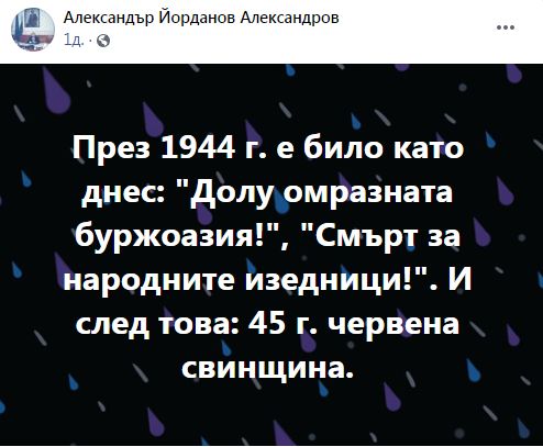 "През 1944 г. е било като днес: "Долу омразната буржоазия!", "Смърт за народните изедници!". И след това: 45 г. червена свинщина", пише Александър Йорданов. В интервю за ПИК той каза, че "служебното правителство е "моделът Радев“ – задкулисие, облечено във власт! Радеворашковизмът е рекомунизация, промяната е подмяна".