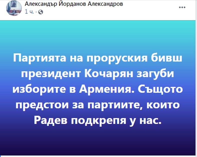 "Партията на проруския бивш президент Кочарян загуби изборите в Армения. Същото предстои за партиите, които Радев подкрепя у нас", категоричен е Александър Йорданов.