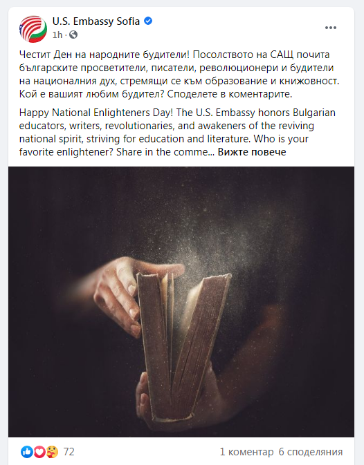 Посолството на САЩ почита българските просветители, писатели, революционери и будители на националния дух, стремящи се към образование и книжовност.
