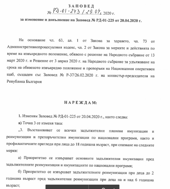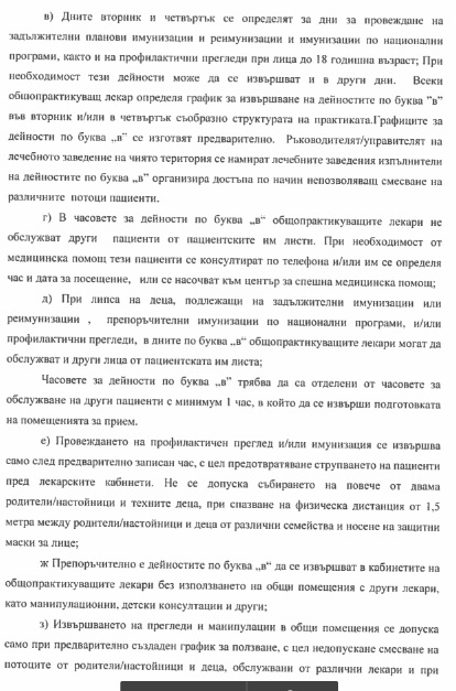 В заповедта е разписан редът, по който да се провеждат задължителните планови имунизации и реимунизации, препоръчителните имунизации по национални програми, както и профилактичните прегледи при лица до 18-годишна възраст при стриктно спазване на въведените противоепидемични мерки.