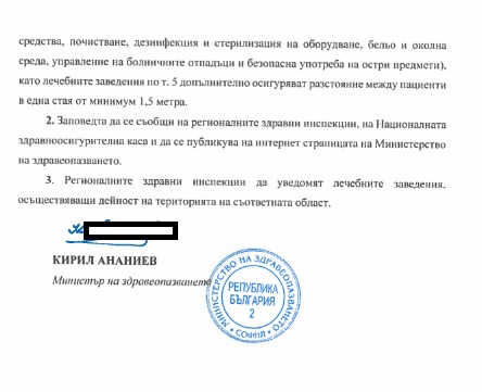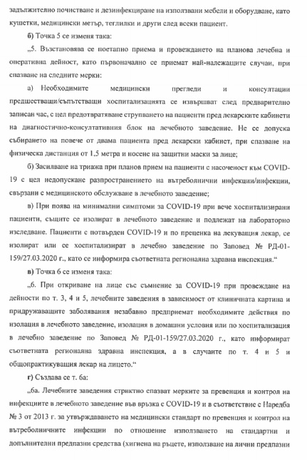 Със заповедта също така се определят редът и мерките, при които да се осъществява приемът и провеждането на планова лечебна и оперативна дейност.
