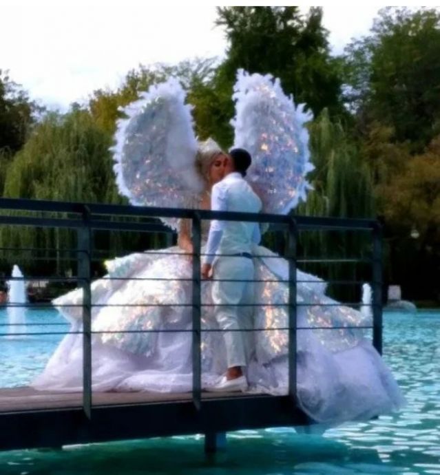 Пловдивска булка изненада мрежата с избора си на облекло. Русокосата дама е избрала изключително пищна бяла рокля и е допълнила тоалета си с не какво да е, а... крила.