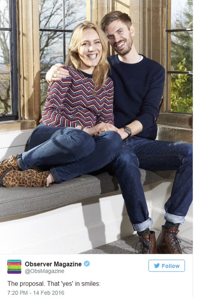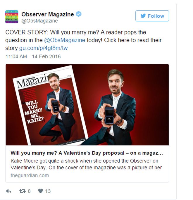 Англичанин предложи брак на приятелката си, появявайки се на корицата на списание „Обзървър" в Деня на свети Валентин.