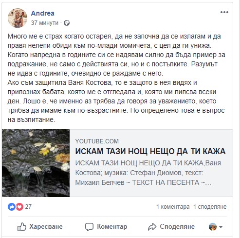 Ако съм защитила Ваня Костова, то е защото в нея видях и припознах бабата, която ме е отгледала и, която ми липсва всеки ден. Лошо е, че именно аз трябва да говоря за уважението, което трябва да имаме към по-възрастните. Но определено това е въпрос на възпитание“, написа серт блондинката в социалните мрежи.